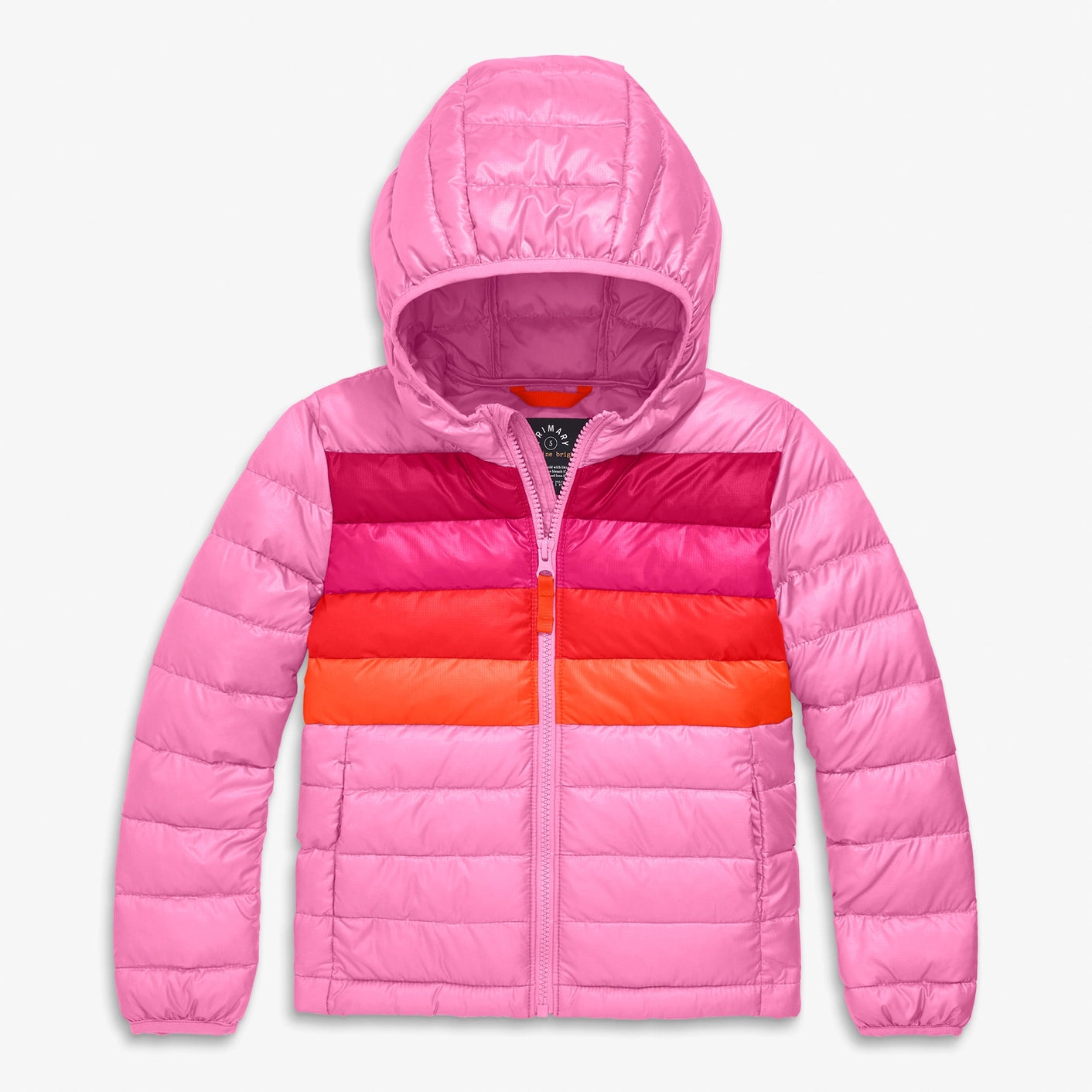 Fabric: 100% recycled polyester ripstop shell that's windproof and water-repellent, with 100% recycled polyester filling. Machine washable. Feel: Smooth and lightweight; just-right for cool weather and easy to layer in brisker temps. Fit: Layer-friendly, hits at hips. Elastic at hood and cuffs helps retain warmth.