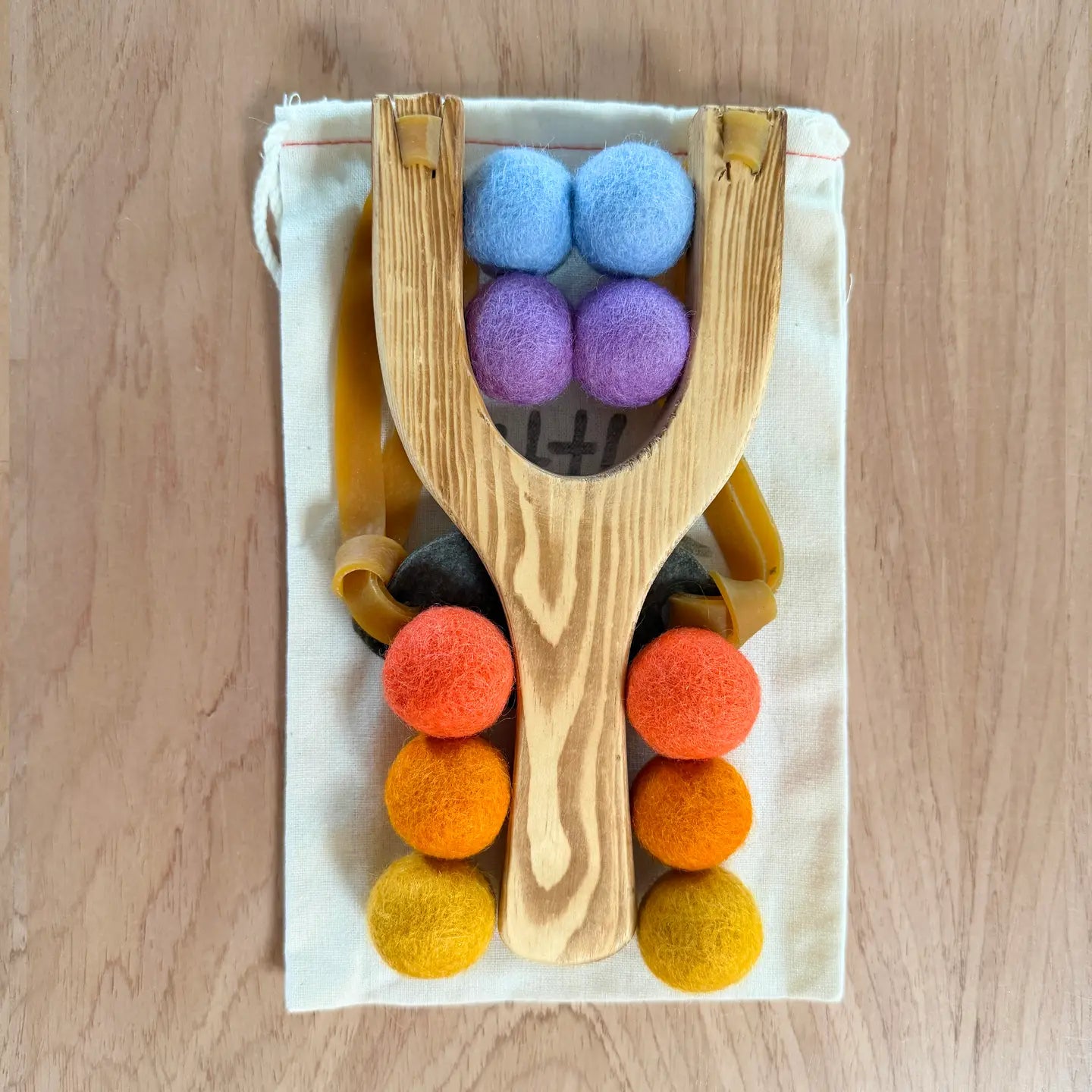 These simple wooden slingshots are perfect for any high energy kid (or adult), plus the 10 wool felt balls that come with each toy makes for gentle play. Materials: wood, rubber, faux leather, paint, wool felt balls, muslin bag, clear bag.