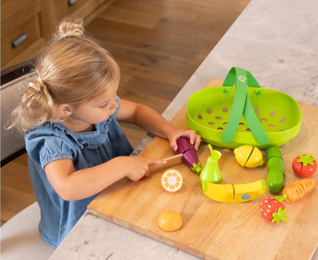 Kids can carry all the wooden fruits and veggies in the bright green basket like they're shopping for the perfect ingredients. Then, they can cut each one into pieces with the wooden knife and cutting board.