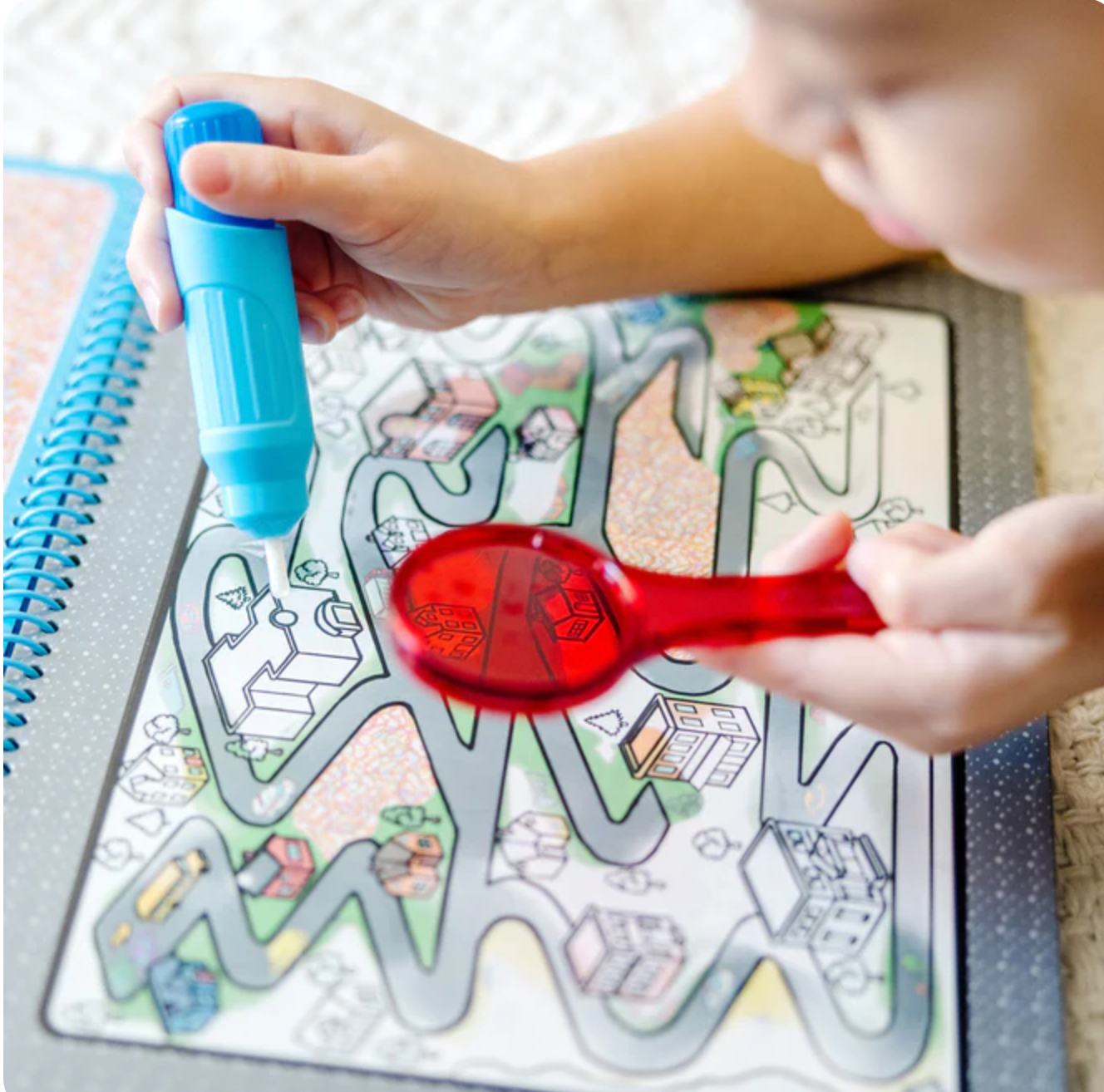 - 8 spiral-bound themed coloring boards, refillable water pen, and red lens