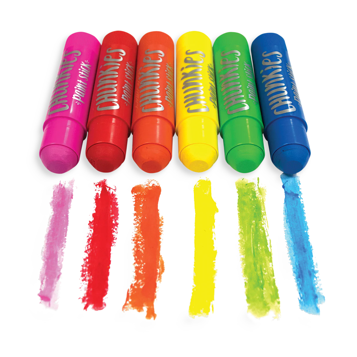 When you want to paint colorful pictures but want to leave the mess behind then it's time to reach for Chunkies Paint Sticks. Chunkies are super easy to use, clean and portable because they're like painting with a crayon. Just uncap, twist and start painting. Chunkies comes in a set of 12 different colored paint sticks each in a thick barreled casing so they're easy for little hands to hold. The paint colors are quick drying and won't smudge, but it's easy to mix colors to make even more colors. It's magic! Care and use recommendations: Keep capped when not in use, to help prevent drying. Cover and protect your workspace. This product may stain some surfaces.