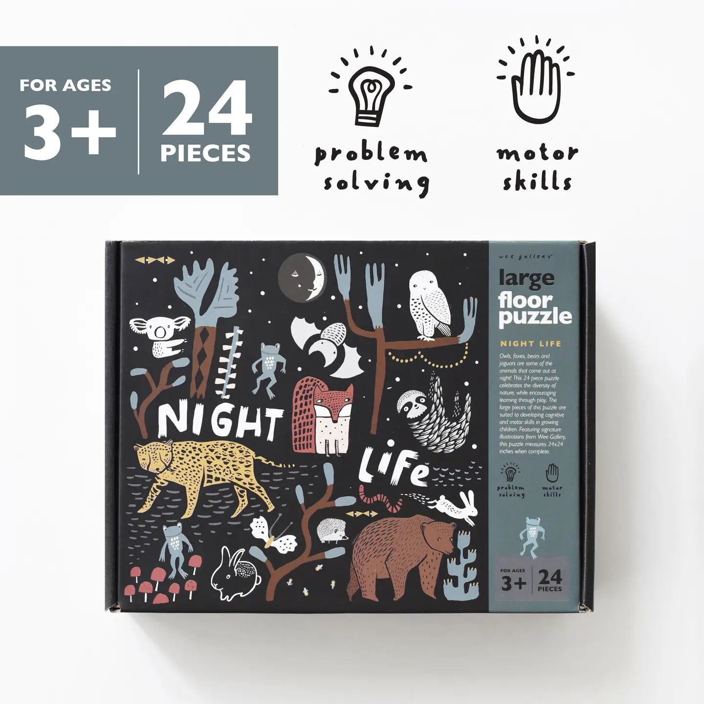 This 24 piece puzzle celebrate the diversity of nature, while encouraging learning through play. The large pieces of this puzzle are suited to developing cognitive and motor skills in growing children. Featuring signature illustrations and quality design. Measuring 24 x 24 inches when complete with high-quality design to support years of play and motor development, problem solving skills, and concentration for toddlers and young children. With interesting animals like brown bear, jaguar, sloth, fox, bat, frog, koala, owl, moth, and rabbit - this puzzle is sure to hold kids' attention. Our Floor Puzzles are constructed of high-quality, eco-friendly materials to support the wellness of your little one and the environment. Made with FSC Certified board and printed with nontoxic soy inks.