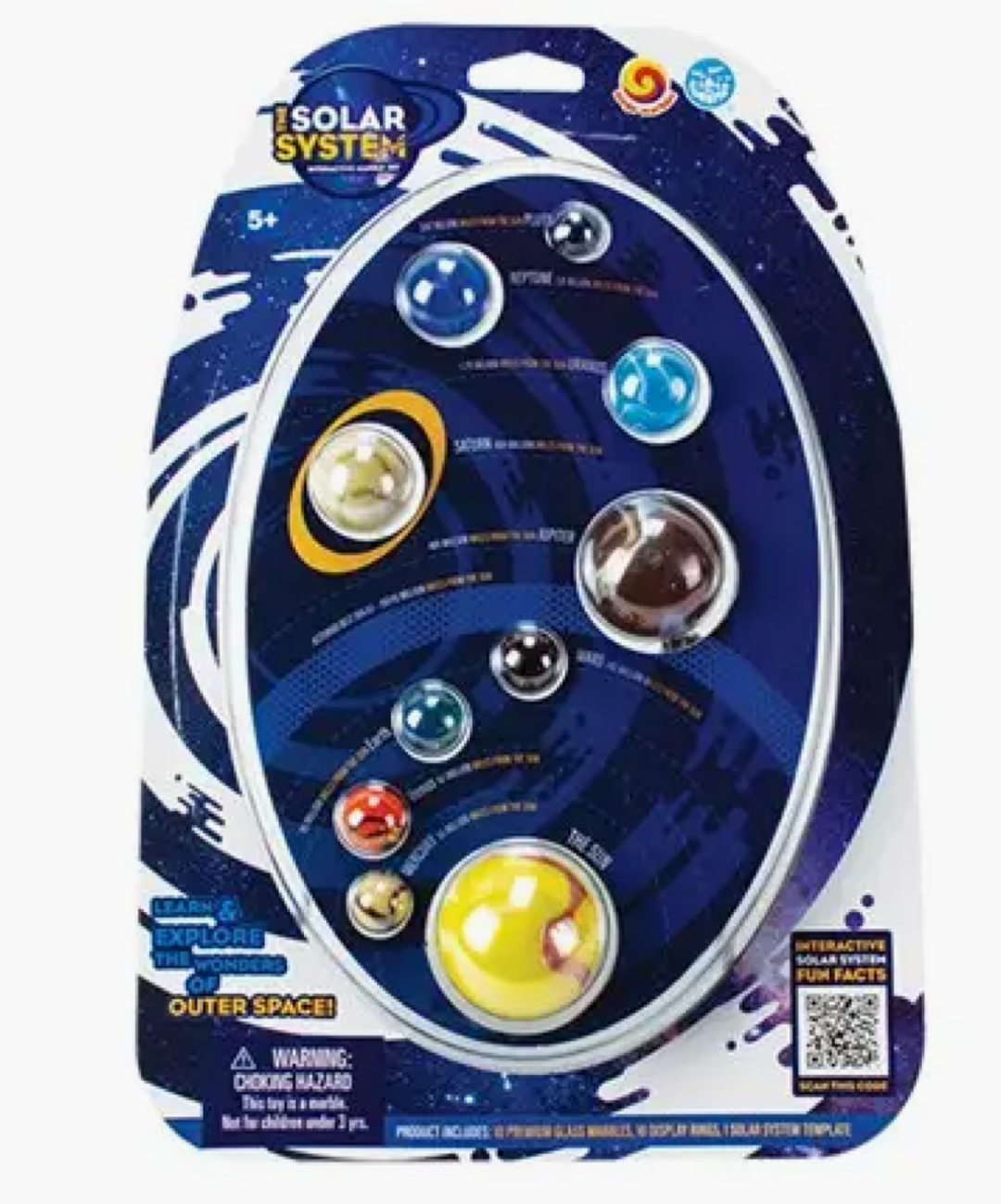 Includes 10 assorted marbles: one mammoth sized (42mm), one boulder sized (35mm), three shooter sized (25mm), three player sized (16mm), one small round sized (14mm), and one peewee sized (12 mm) marbles. Also includes 10 display rings to showcase the planet marbles on a desk or table.