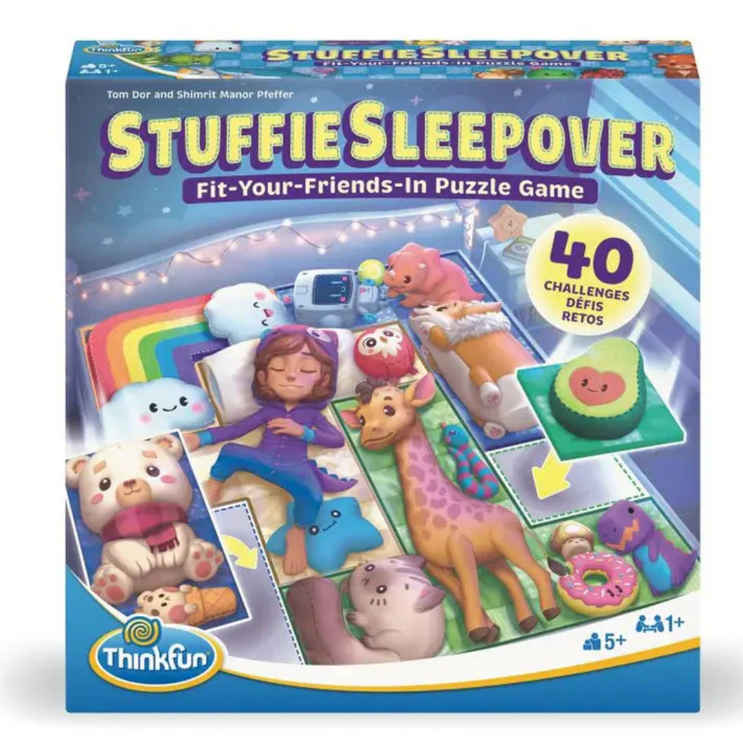 Fit-Your-Friends-In Puzzle Game Take your kid's stuffed animal obsession to the next level! Introducing ThinkFun's Stuffie Sleepover. Arrange the Stuffies to Complete the Puzzle. A Fun Logic Game for Young Minds!