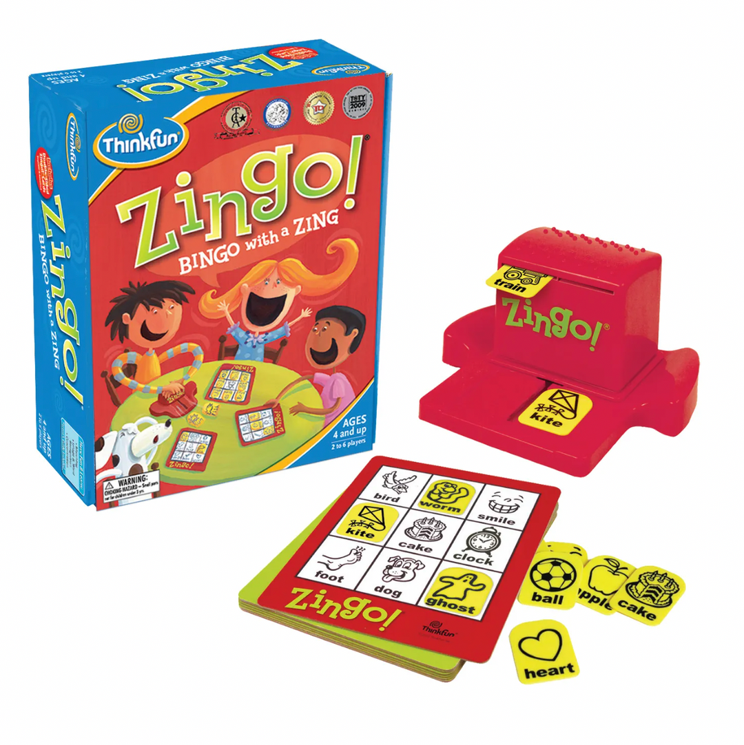 It’s not just bingo. It’s Zingo!, a matching game that encourages pre-readers and early readers alike to match the pictures and words to their challenge cards. The Zingo! Zinger dispenses tiles and fun as young minds quickly race to be the first player with a full card and yell “ZINGO!” With two levels of play, this matching game builds language skills through fast-paced play. And it happens to be our top selling junior game.
