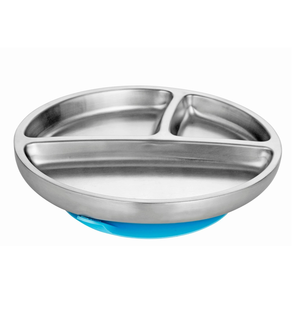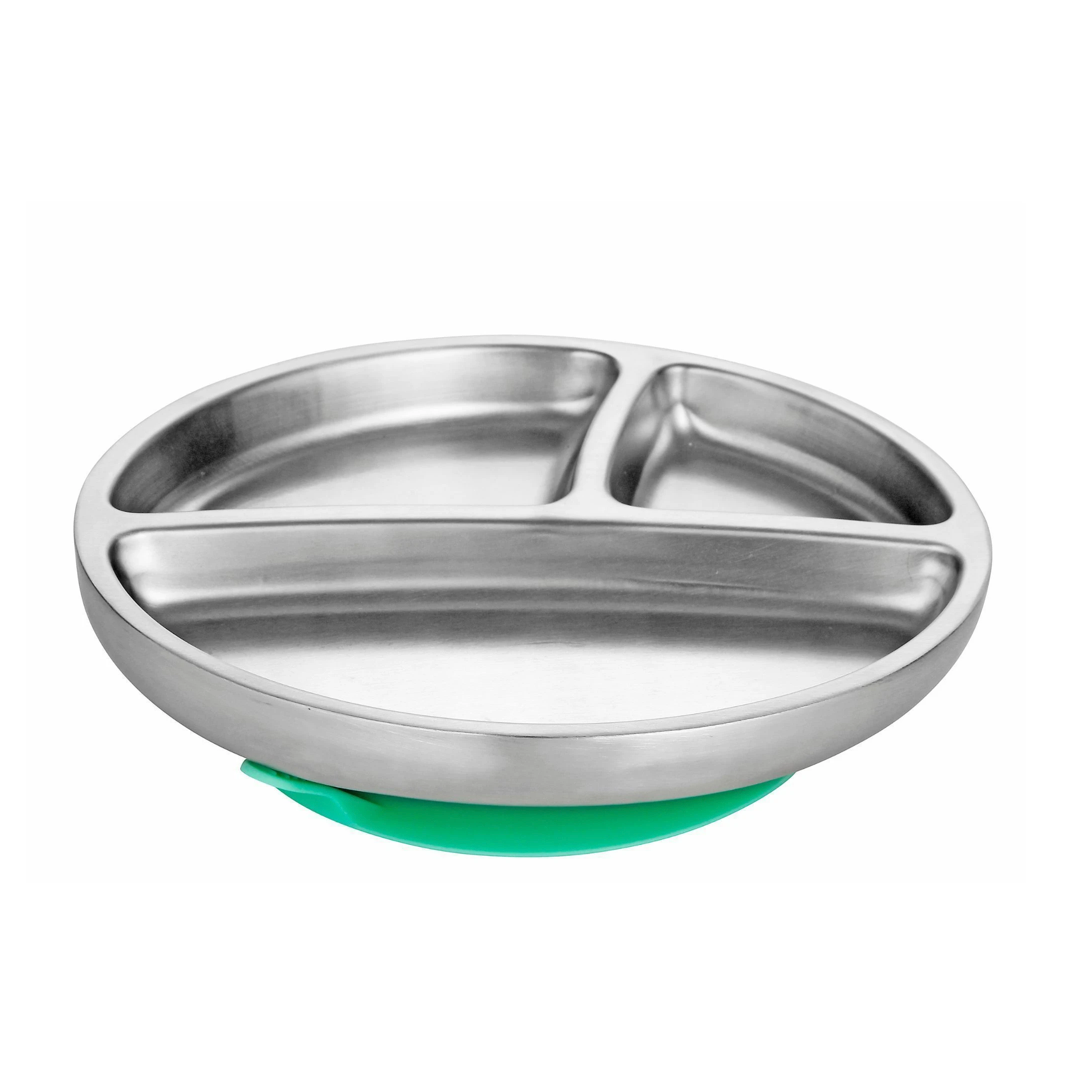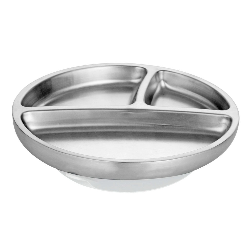 The Avanchy Stainless Steel Toddler Plate with removable silicone suction is a durable and practical solution to messy meals.